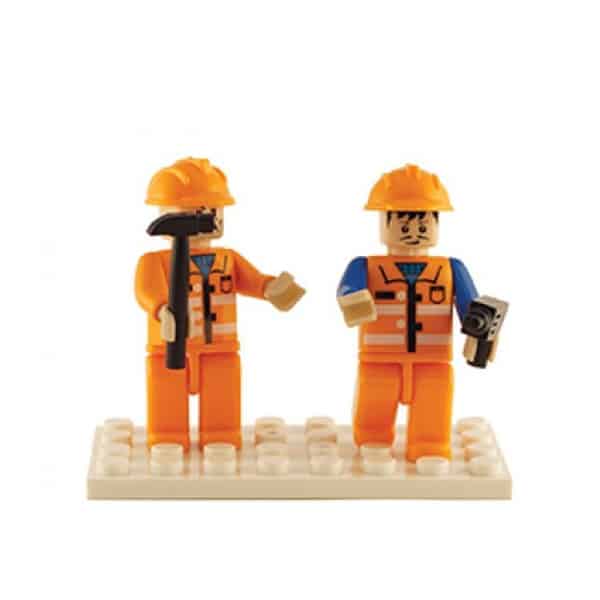- Kaksi rakennusmieshahmoa, joilla tarvikkeita.