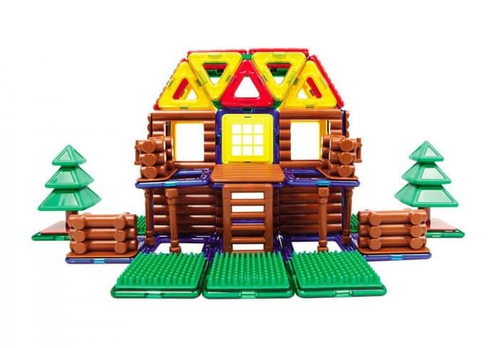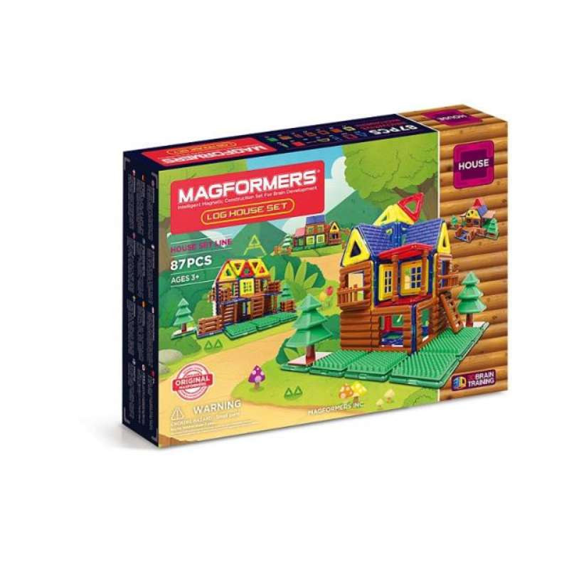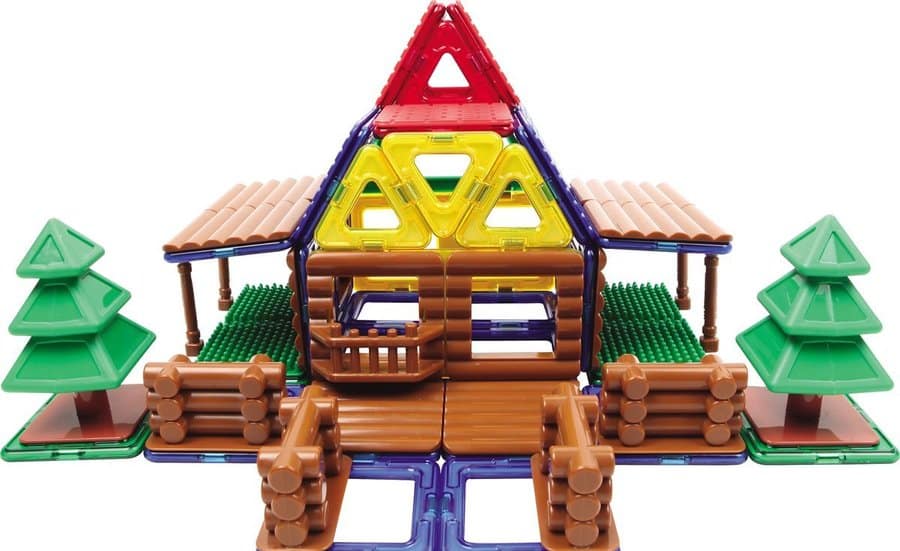 Suuri magneettinen paneeli rakkennussarja, josta voit loihtia erilaisia hirsirakennuksia.