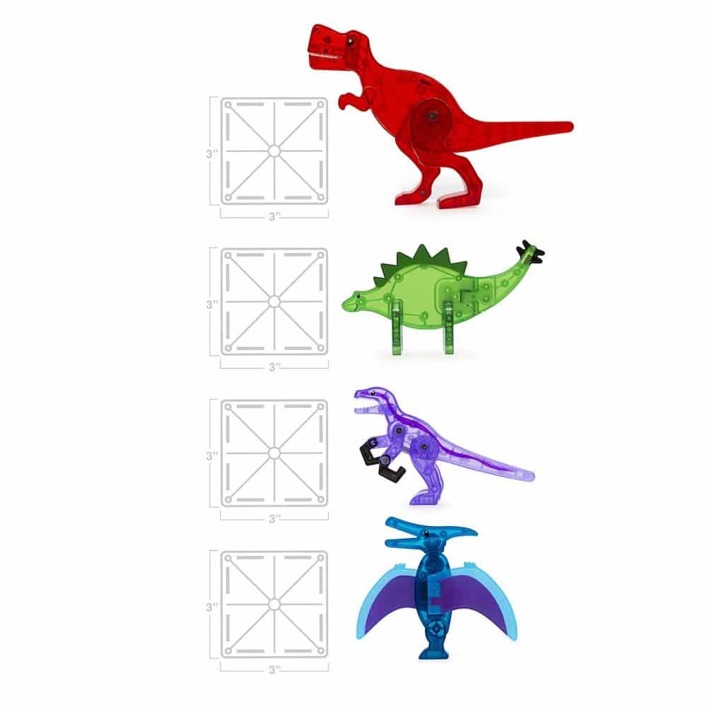 - 40 magnetic pieces, featuring 4 Dinosaur Figurines including Pteranodon (Blue), T-Rex (Red), Stegosaurus (Green) and Velociraptor (Purple), 24 Squares, 6 Right Triangles, 1 Rectangle, 1 Large Rectangle, 4 Quarter Circles. What Makes It Unique: Features volcanic-themed tiles that are erupting with play potential.