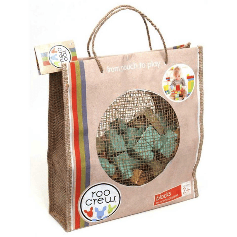 Pääosin kierrätysmateriaaleista valmistettu Roo Crew -rakennuspalikkasetti sisältää 50 erikokoista, värikästä rakennuspalikkaa. Pienetkin sormet saavat jämäkän otteen kookkaista palikoista, ja erilaisten muotojen yhteensovittaminen kehittää niin motorisia kykyjä kuin kärsivällisyyttäkin.