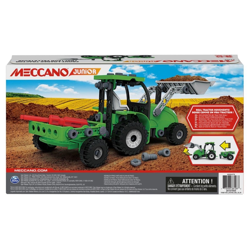 Meccano on hauska rakentelusarja, joka herättää lasten mielenkiinnon rakentamiseen ja robotiikkaan. Tyylikäs ja ikoninen traktori on valmis rakennettavaksi! Tällä setissä nuoret rakentajat pääsevät käytännön tosi toimiin, kun he käyttävät mukana tulevia oikeita työkaluja luodakseen autenttisen Meccano Junior-traktorin. Kun traktori on valmis, rakentajat voivat ylpeästi laittaa luomuksensa näytteille tai viedä uuden ajokkinsa ajelulle. Mukana tulee Meccano traktori nousevalla kauhalla ja peräkärry, jonka voi kiinnittää traktoriin. Loogista ajattelua ja motoriikkaa kehittävä lahjaidea!