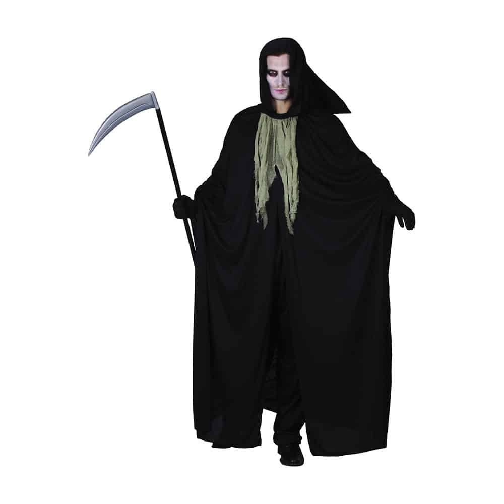 Aikuisten viikatemies – Musta kokonainen hupullinen viitta, täysin avoin ja kaikki yhtenä kappaleena. Khakinvärinen ”kaulus” kiinnitetään tarranauhalla ja se on helppo irrottaa. Mukana hupullinen viitta.