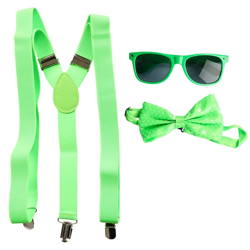 - Setissä kirkkaan neonvihreät henkselit, lasit ja rusetti