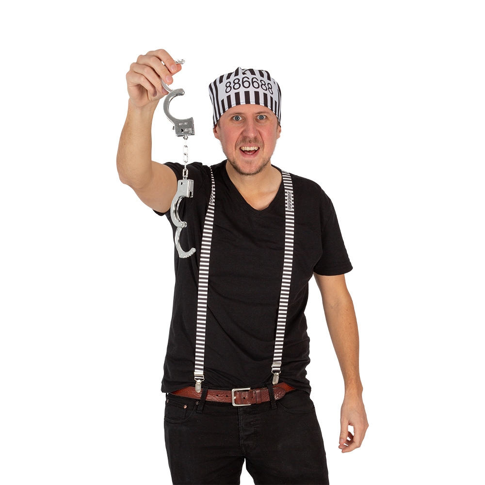 Eläydy vangin rooliin, kun puet yllesi nämä hauskat vermeet! Tämä asustesetti on loistovalinta esim. halloween-juhliin.