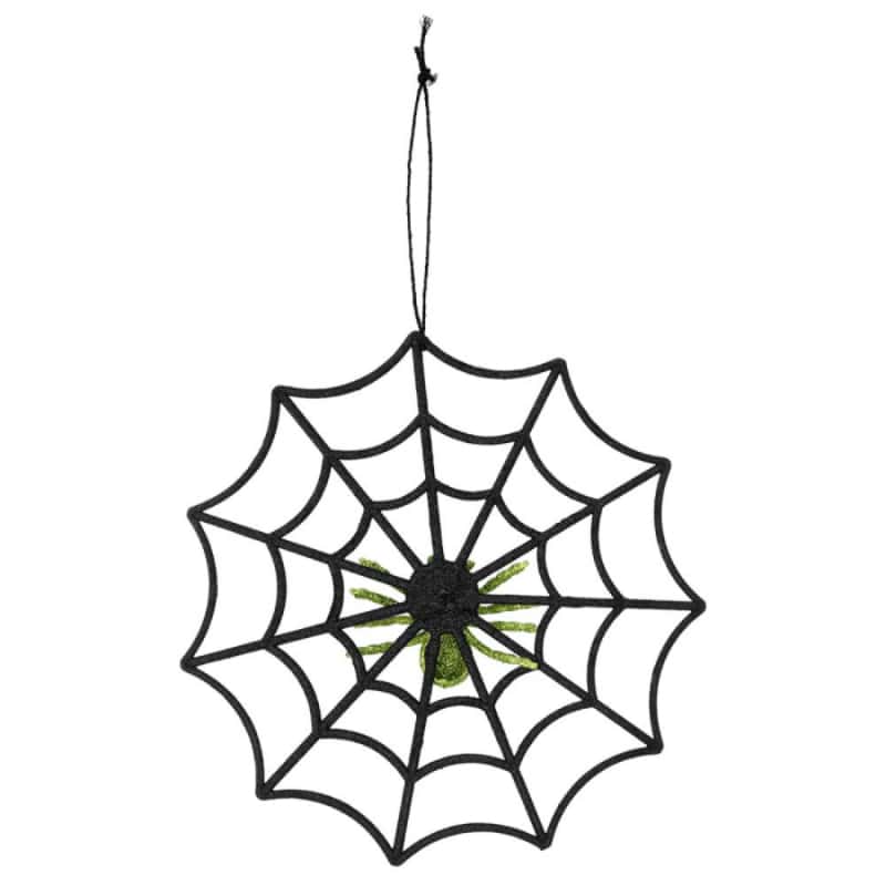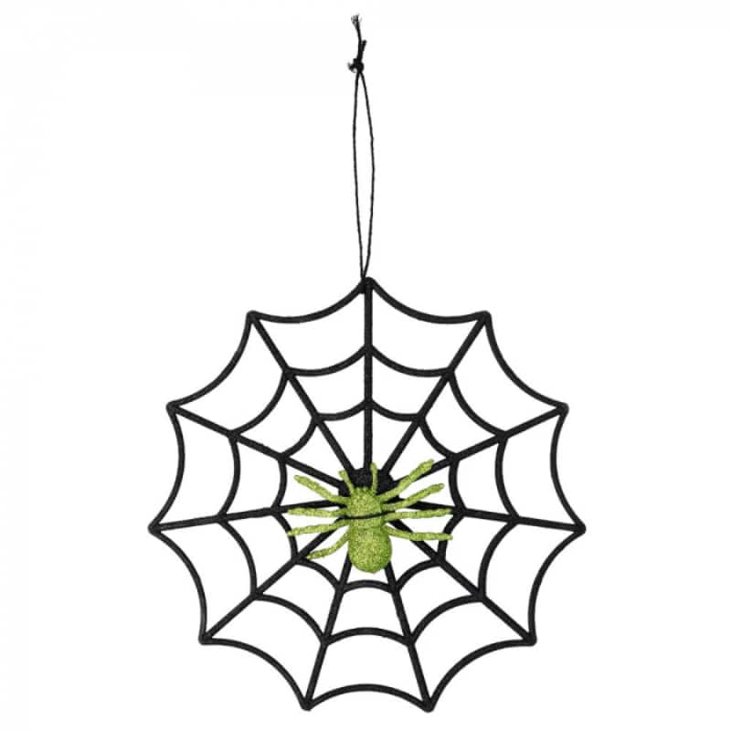 Koristele kotisi tällä hienolla kimaltelevalla hämähäkki-koristeella. Hämähäkinverkkokoriste on musta ja siinä on kultainen irrallaan oleva noin 11 cm leveä hämähäkki. Koriste on noin 30 cm leveä.