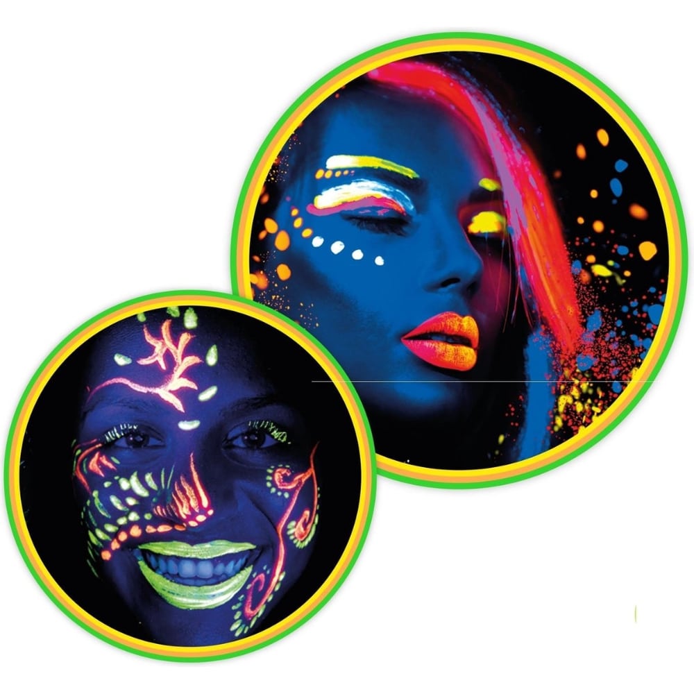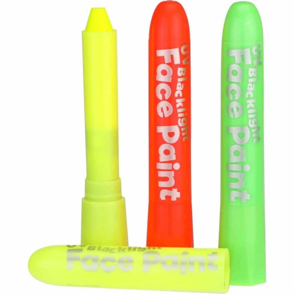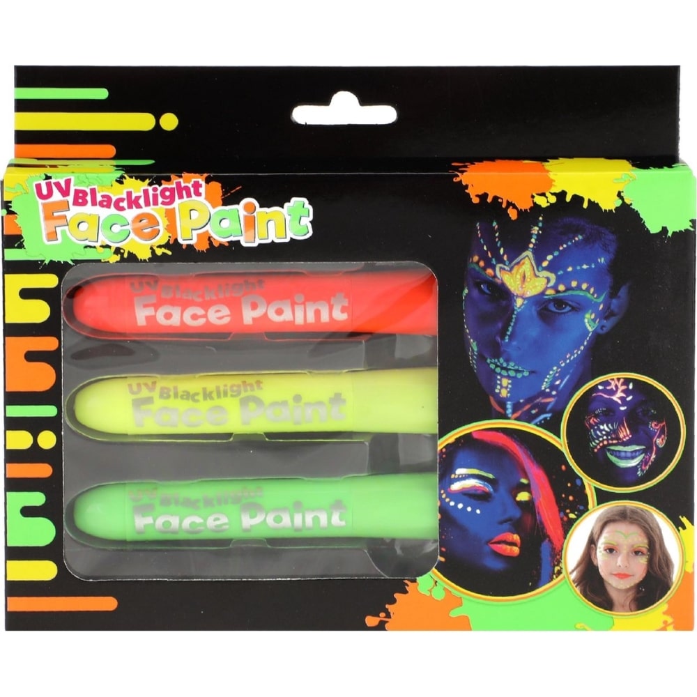 Kasvomaali UV-valo meikkipuikkoja on erittäin helppo levittää. Tee upeita luomuksia. Tussit takaavat paljon hauskoja hetkiä! Meikki on helppo poistaa. sisältää kolme meikkipuikkoa eri väreissä. Värit: keltainen, oranssi ja vihreä. 3+