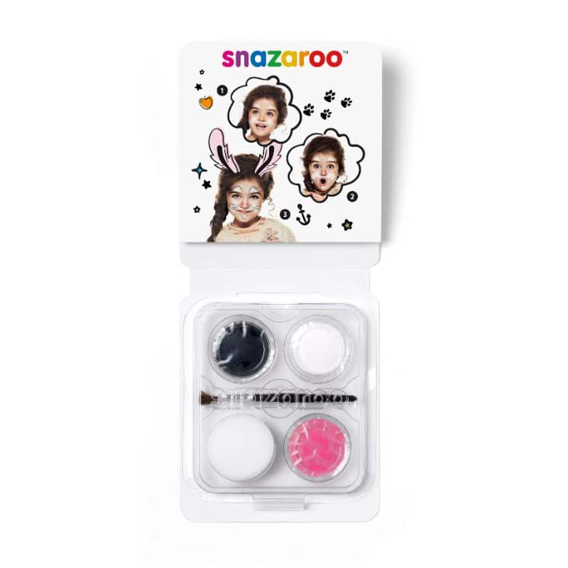 Tällä kasvovärisetillä voit tehdä hienoja kasvomaalauksia, kuten vaikka pupun tai enkelin! Pupulajitelma sisältää pinkin, valkoisen ja mustan 3,75 grammaisen värinapin, siveltimen ja vaahtomuovisienen.