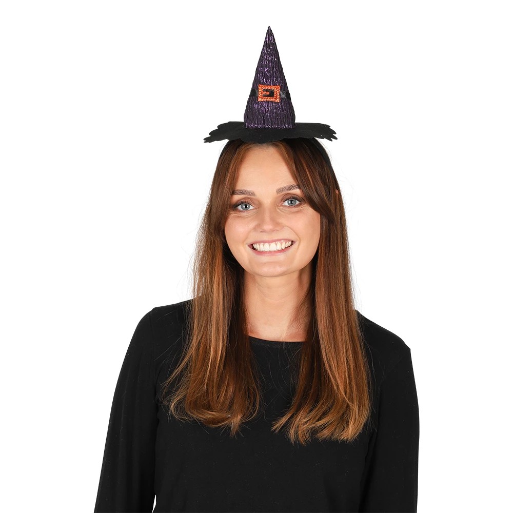 - Kevyt hiuspanta, johon kiinnitetty lila noitahattu