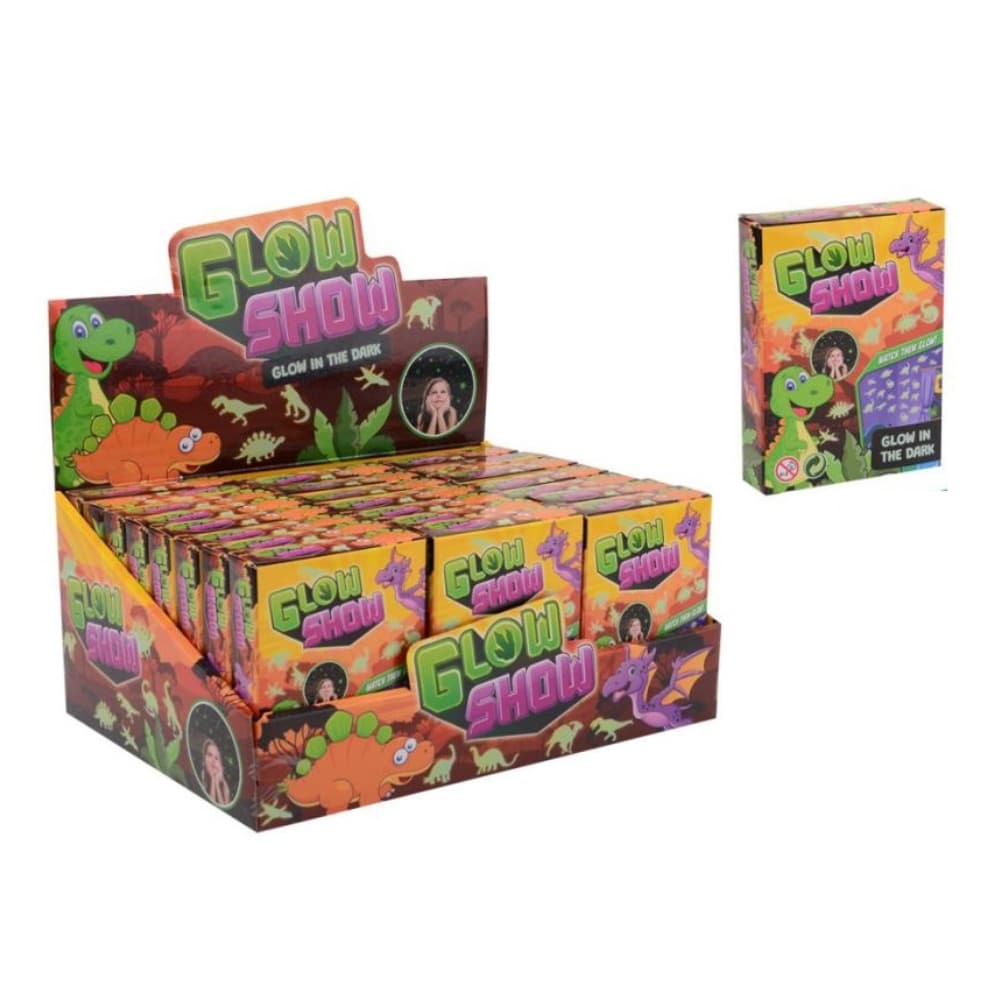 Pimeässä hohtavat dinot & tähdet – “Tuiki tuiki dinosaurus ja tähtönen, iltaisin sua ihastelen ja katselen.” Tee hauska dinosaurustaivas ja tähti asetelma esimerkiksi huoneen kattoon tai seinille. Kuviot keräävät itseensä valoa, jonka jälkeen ne hohtavat pimeässä. Pakkauksessa tulee mukana kaksipuoleisia tarroja, joilla kuviot voi kiinnittää. Pakkauksessa on yhteensä 13 pimeässä hohtavaa tähteä ja dinosaurusta. Ikäsuositus: 3+ vuotta.