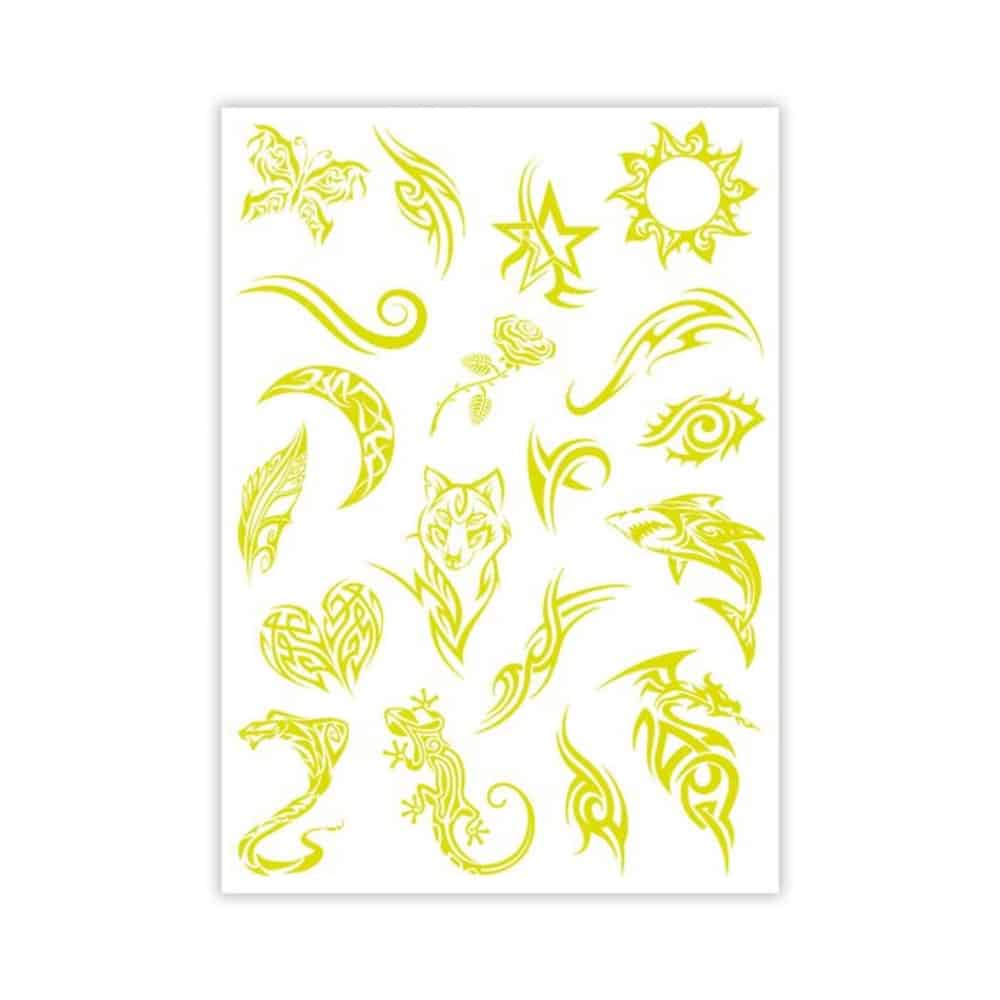 Pimeässä hohtavat tatuoinnit ovat jännittävä näky diskossa! Tatuoinnit ovat helppo kiinnittää. Pakkauksessa yksi arkki pimeässä hohtavia tatuointeja. Ikäsuositus yli 6-vuotiaille.