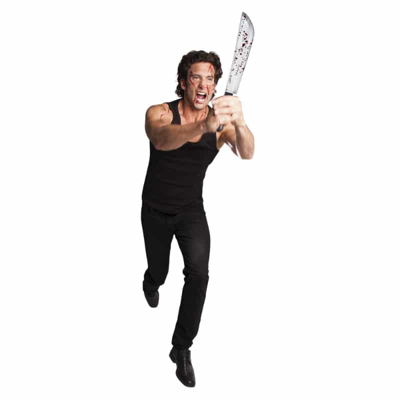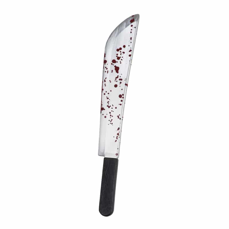Muovinen teurastajan veitsi veritahroilla pelottaviin Halloween-juhliin koristeeksi tai naamiaisasun lisukkeeksi. Pituus noin 53 cm.