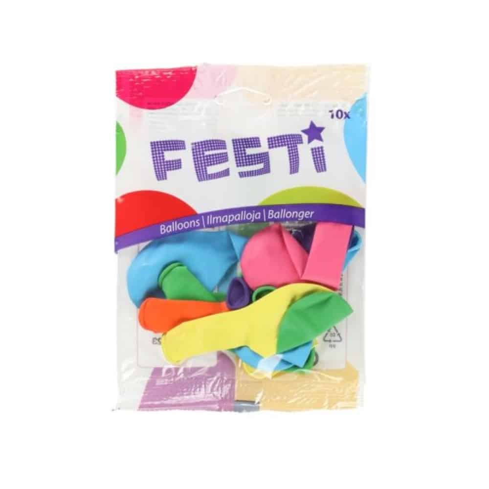 Ilmapallo 10 kpl Festi – Luonnonkumista valmistettu ilmapallo. Pussissa eri värisiä palloja. Halkaisija 22 cm.