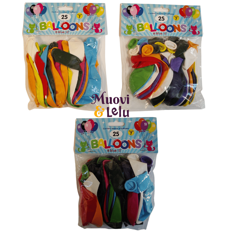 25 eri väristä ilmapalloa syntymäpäivä- ja muihin juhliin. Näihin ilmapalloihin käy myös heliumtäyttö. Ilmapalloja ei ole suositeltavaa täyttää yli 30 senttimetriä suuremmaksi, jotta ne eivät räjähdä. Ilmapallot ovat tehty 100%:sti luonnon latexi kumista. Laboratorio testattu. Biologisesti hajoavat.