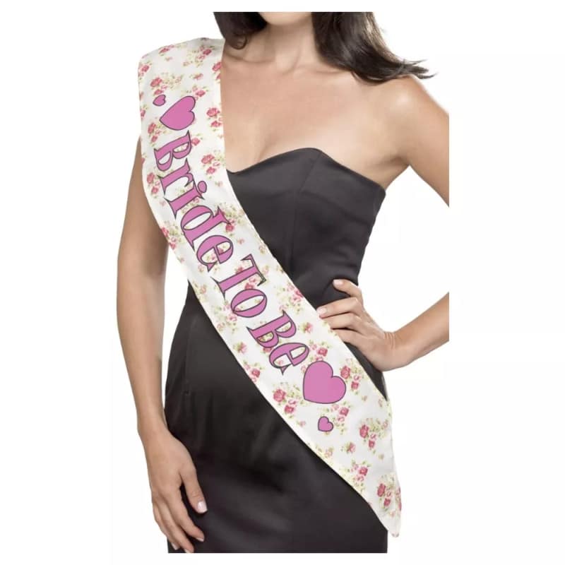 Näyttävä kankaasta valmistettu, vintage-tyylinen Bride to Be -polttarinauha. Kukkakuvioitu olkanauha polttarisankarille isolla Bride to Be-tekstillä ja sydämillä. Tyylikäs vaihtoehto tulevalle morsiamelle polttarijuhliin!