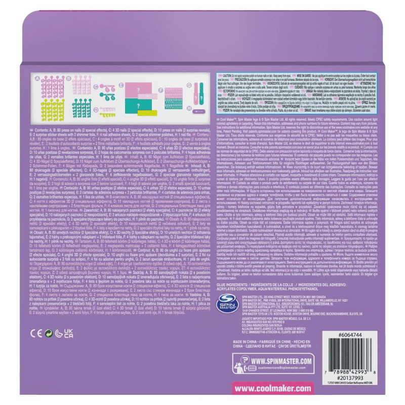 Rullaa ja leimaa kimaltelevia mani-pedejä Cool Maker GO GLAM U-nique kimallekynsisalongilla! Suunnittele jopa 360 erilaista kynttä viidellä eri design-kuviorullalla (neljä eksklusiivista metallia ja yksi klassinen), neljällä kynsilakkavärillä (mukaan lukien eksklusiivinen musta!). Se sisältää sisäänrakennetun kuivaajan ja säilytystilan. Koneessa on myös metallinen viimeistely ja irrotettava leimasin, jonka voi ottaa kätevästi reissuille mukaan! Salonkilaatuisten räätälöityjen manikyyrien tekeminen on hauskaa ja helppoa tämän kynsipakkauksen avulla. Valittavana on 200 ainutlaatuista kuviota, joista voit yhdistellä klassisia malleja, sekä metallisia kirjaimia, kuvioita, jalokiviä ja kuvioita, jotka tekevät kynsistäsi persoonalliset! Voit jopa leimata mukautettuja viestejä kynsiisi kirjaimilla! Säilytä design-kuviorullia kynsikoneen alustassa ja laita kaikki muut tarvikkeet säilytystilaan. Ota salongin kannettava leimasin mukaasi minne tahansa! Tämä all-in-one kimallekynsipakkaus on loistava lahja tytöille ja täydellinen aktiviteetti yökyliin, kylpyläpäiviin, syntymäpäiviin ja muihin hauskoihin tapahtumiin.