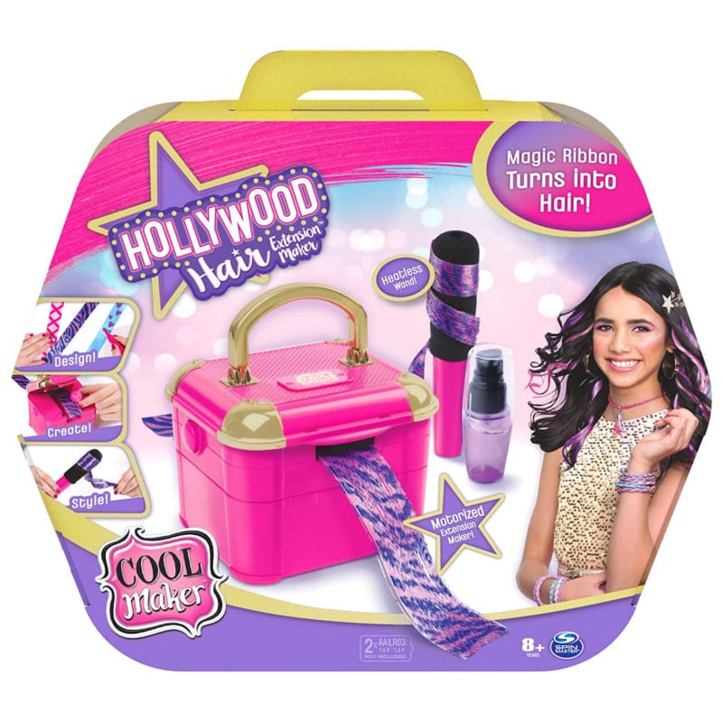 Suunnittele ja luo omat hiustenpidennyksesi Cool Makerin Hollywood hiuspidennys laitteella. Tämän tee-se-itse studion mukana tulee kaikki mitä tarvitset omien hiustenpidennysten luomiseen. Pidennysten luominen on helppoa: Valitse ensin värillinen tai kuvioitu hiusnauha, koristele se haluamallasi tavalla ja laita hiusnauha laitteen läpi. Laite muuttaa hiusnauhan hiustenpidennykseksi, jota voit käyttää hiuksia koristamassa. Voit kihartaa pidennyksen mukana tulevalla kihartimella. Kiharrin on turvallinen, sillä se ei lämpene.