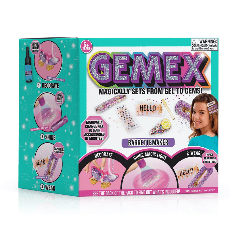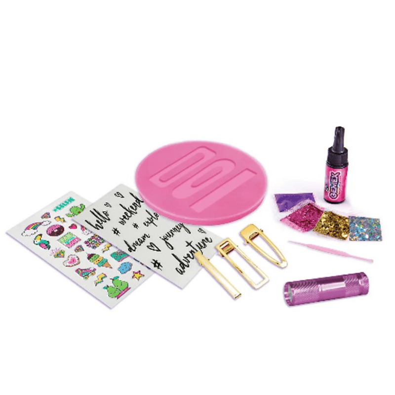 Gemex hiuskoriste setillä valmistat ihania hiuskoristeita! Taianomaiset Gemex korut valmistuvat silmänräpäyksessä. Kaada vain nestemäinen massa muottiin, lisää koristeita ja kimalletta ja pidä UV-valon alla 3-5 minuutta. Massa on kovettunut ja voit käyttää ihanaa hiuskoristettasi. Pakkauksessa tarvikkeet neljän erilaisen pinnin luomiseen.