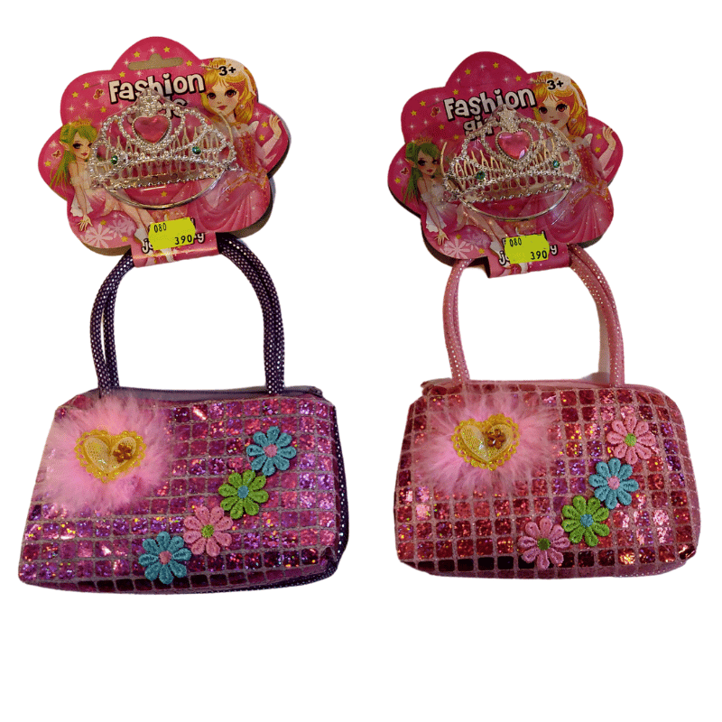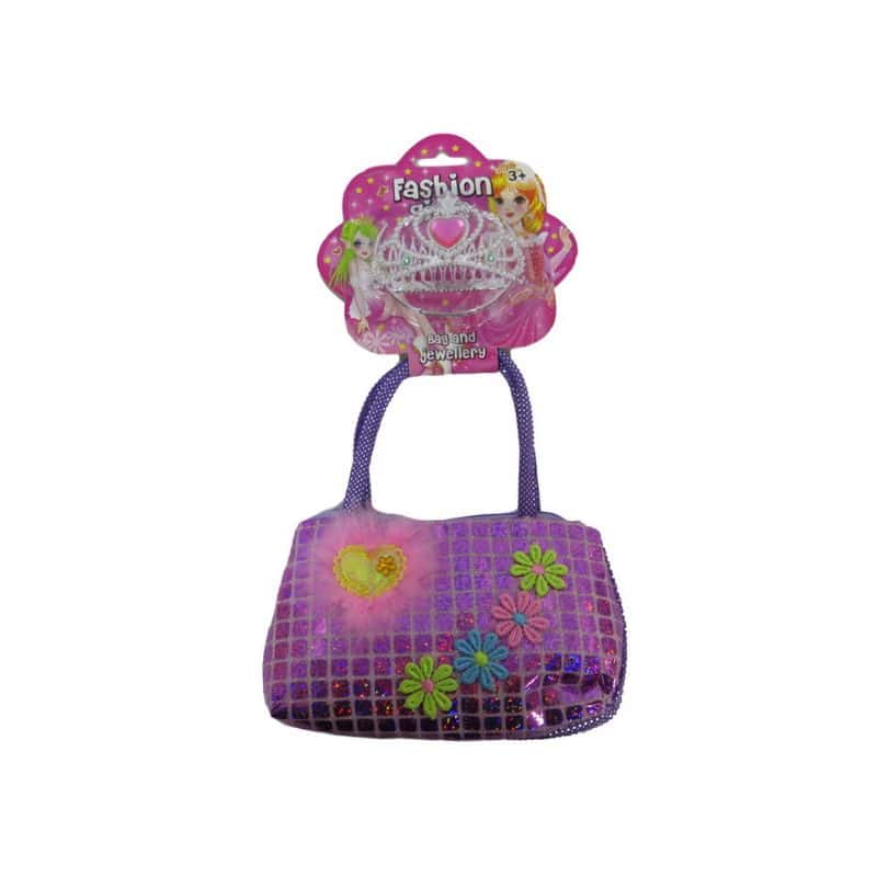 Kimalteleva ja yksityiskohtainen käsilaukku, jossa on kukkakoristeita. Tuote sisältää käsilaukun lisäksi prinsessan tiaran, jossa on jalokiviä.
