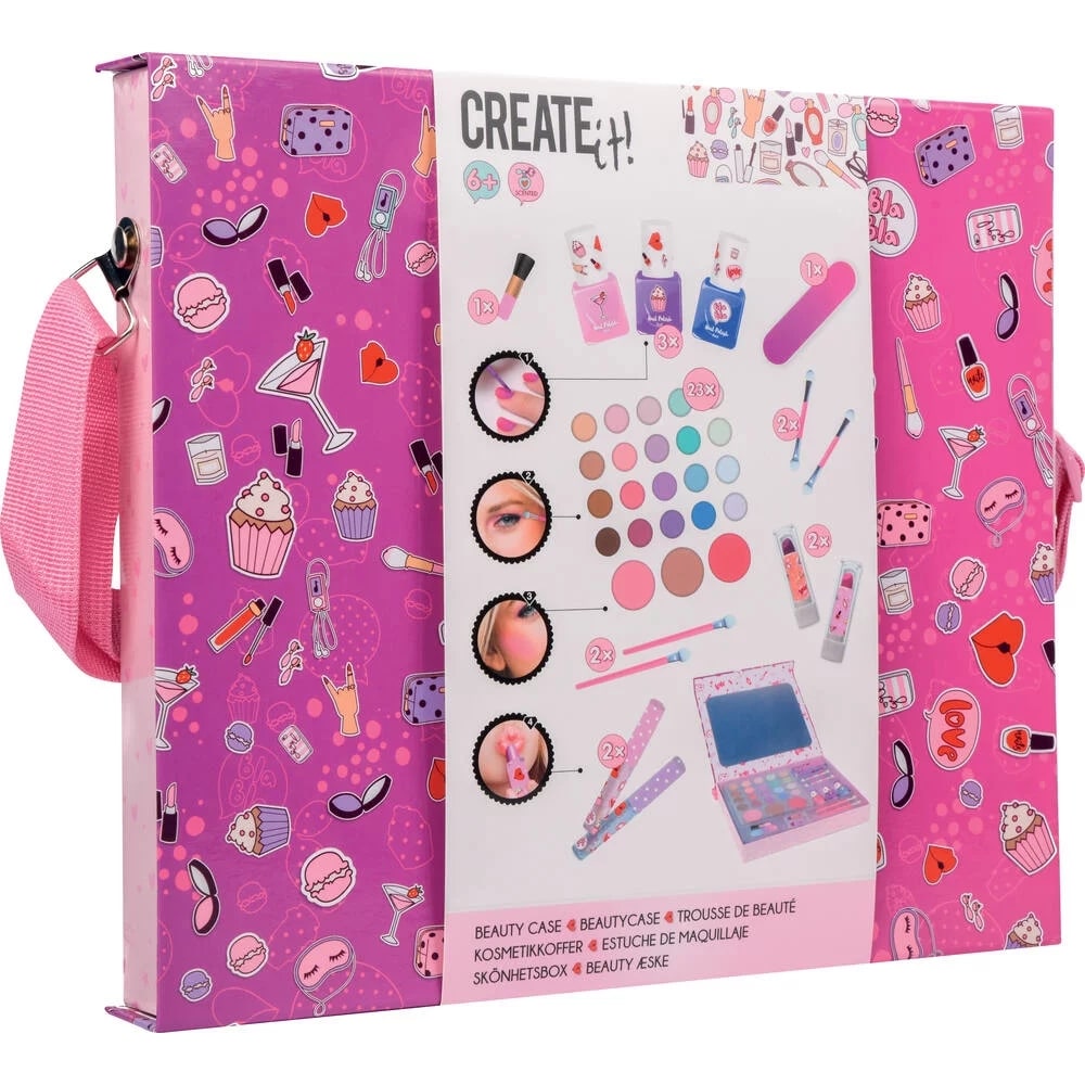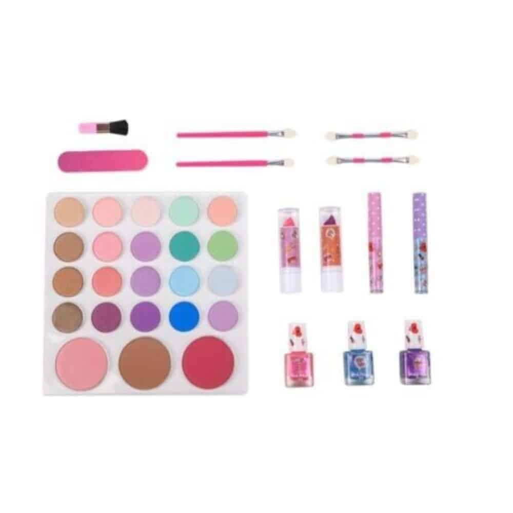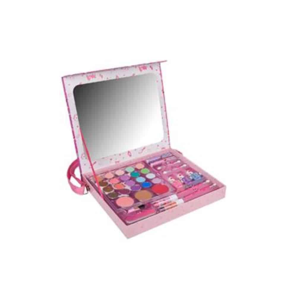 Täydellinen Meikkilaukku kantohihnalla. Sisältää kaiken tarvittavan: meikkisiveltimiä, huulipuna ja -kiilto puikkoja, kynsiviilan ja kynsilakkaa, poskipunia, luomivärejä ja tietenkin lokerollisen säilytystilan niille. Salkun kannen sisäpuolella on suuri peili. Hajusteellisia. 6+