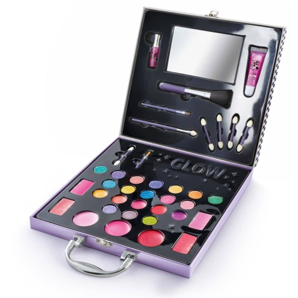 Meikkipalettisalkku, jossa 20 luomiväriä, 6 huulikiiltoa, 4 poskipunaa ja 9 sivellintä.