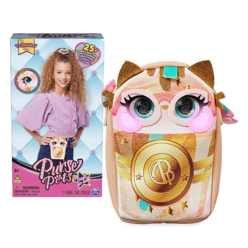 Tämä trendikäs kissakäsilaukku reagoi kosketukseen ja sen posket hehkuvat! Liikkuessaan laukun posket vaihtavat väriä ja se on vuorovaikutuksessa kanssasi. Silitä Pupsicle-laukun päätä kuullaksesi suloisia käpertelyääniä! Purse Pets-laukussa on yli 25 äänellä ja reaktiolla! Treat Yo Self Pupsicle muuttaa poskien väriä, päästä suloisia ääniä, pussaa, soittaa musiikkia ja paljon muuta! Pentu voi myös ennustaa mielialaasi. Kosketa laukun otsaa ja sen posket loistavat ennustusväriä. Laukussa on kimaltelevat korvat, sen materiaali on keinonahkaa ja siinä on pitkä nauha. Purse Pets-lelut ovat täydellisiä tyttöjen asusteita ja upeita lahjoja 5-vuotiaille ja sitä vanhemmille tytöille.
