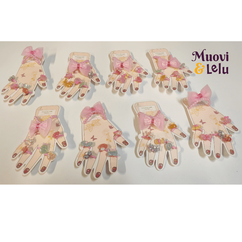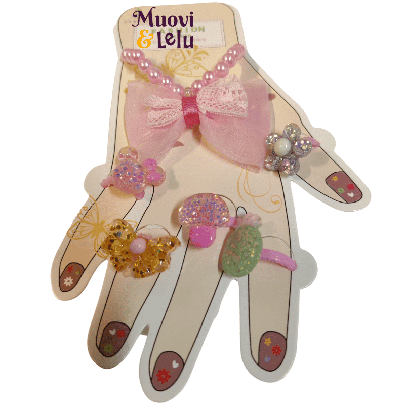 Jokainen pikkuprinsessa ihastuu varmasti näistä koruista. Pakkauksessa on viisi erilaista glitter sormusta ja kaunis rusetilla koristeltu vaaleanpunainen helmirannekoru. Korut ovat lapsen käteen sopivia.