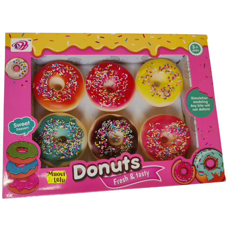 Aidon ja syötävän herkullisen näköiset leikkidonitsit eri mauissa ja väreissä. Donitsit on koristeltu värikkäillä strösseleillä.