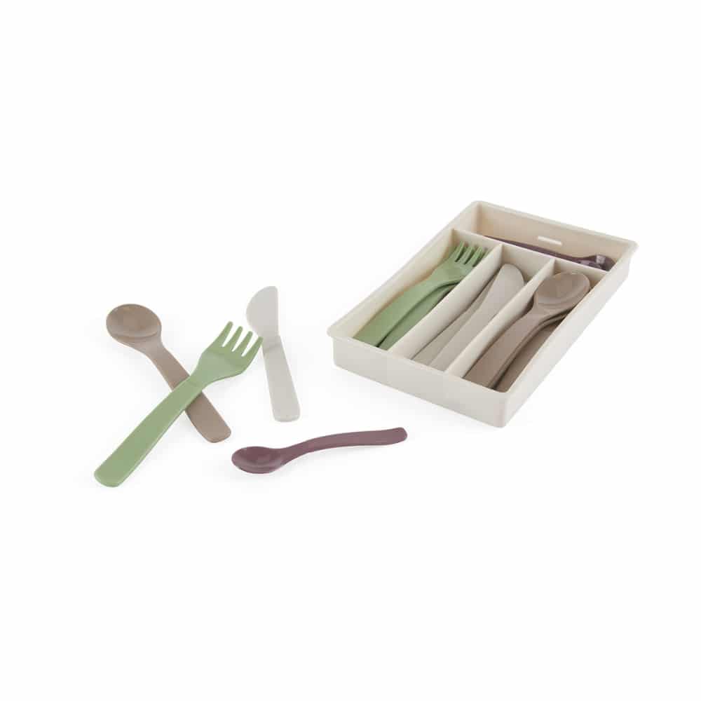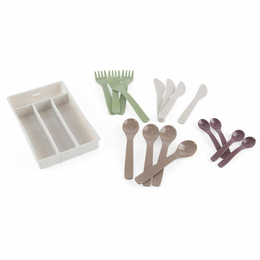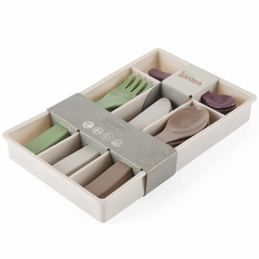 Ekologiset Dantoy-leikkiaterimet sopivat mainiosti keittiöleikkeihin niin sisällä kuin ulkona! Aterinsetti sisältää aterinlaatikon sekä haarukat, veitset, lusikat ja teelusikat neljälle pienelle ruokailijalle. Aterimet on valmistettu elintarvikelaatuisesta muovista, jolloin ne sopivat myös ihan oikeaan ruokailuun. Ekologiset Dantoy-leikkiaterimet voidaan pestä tiskikoneessa. Kauniit murretut värisävyt.