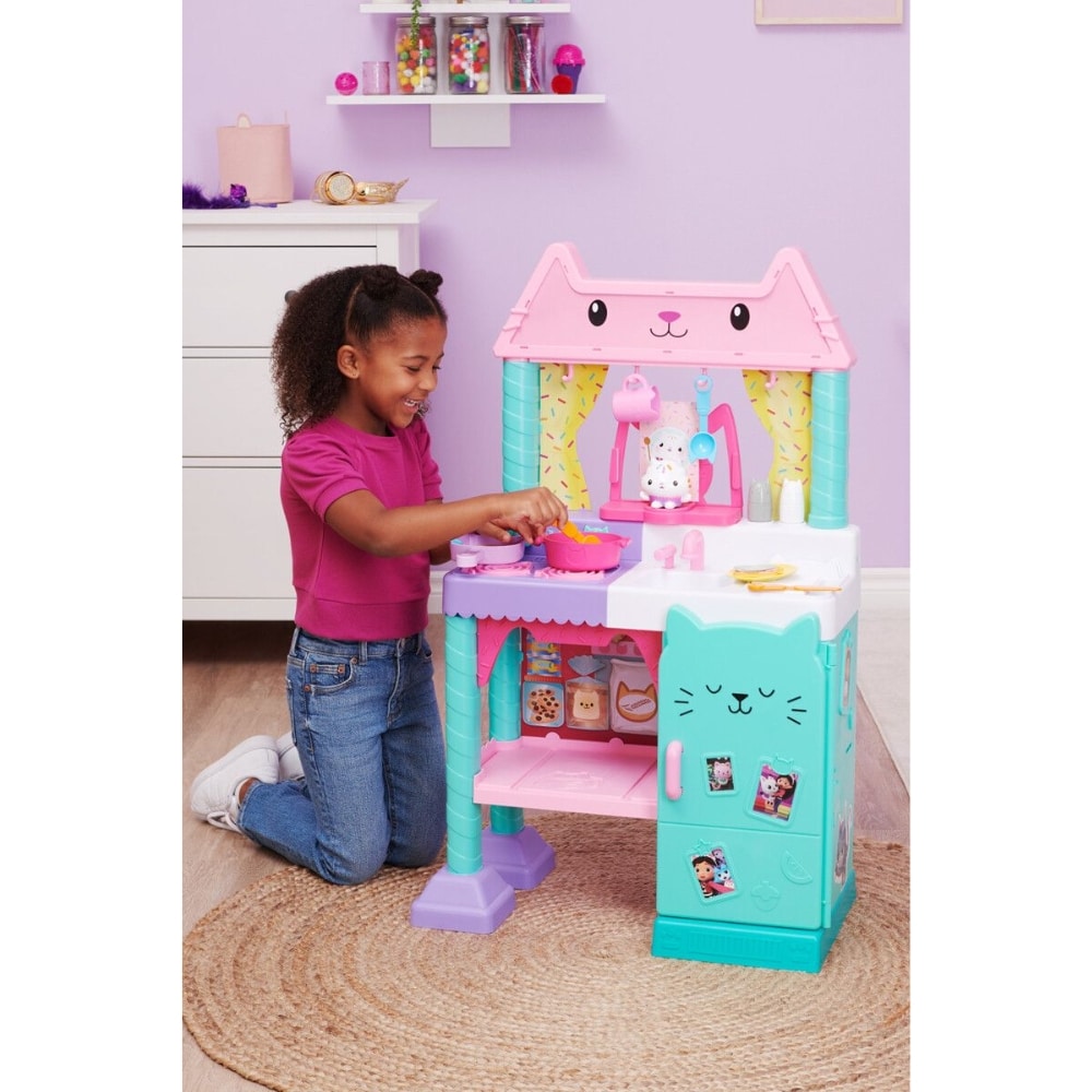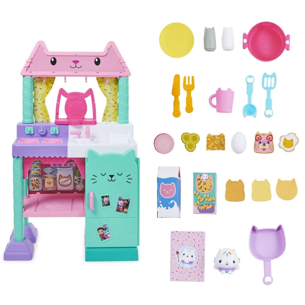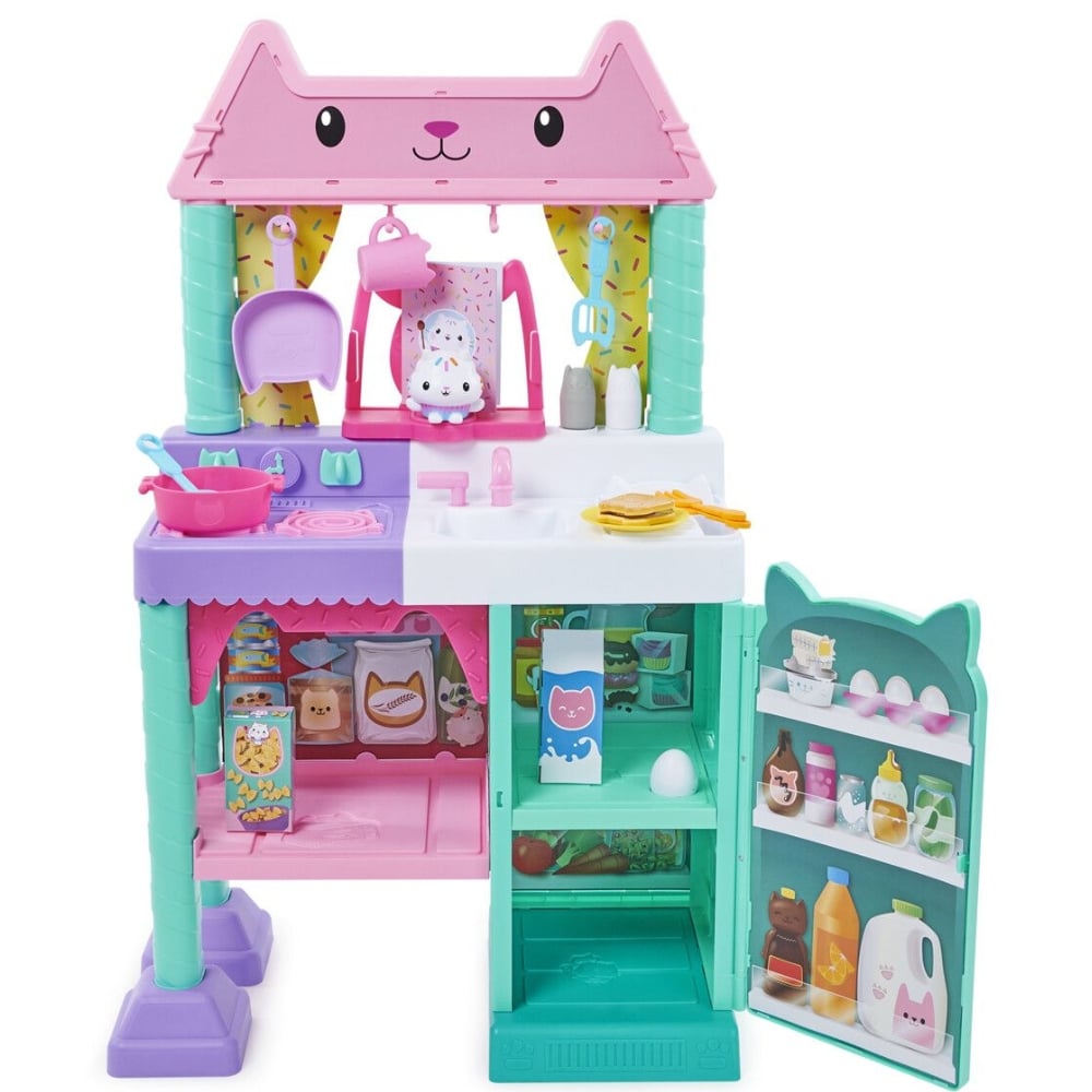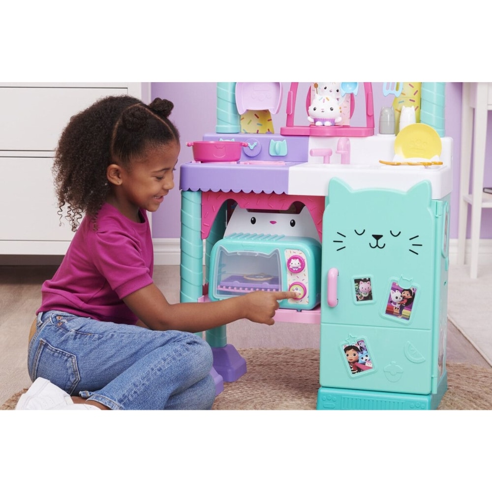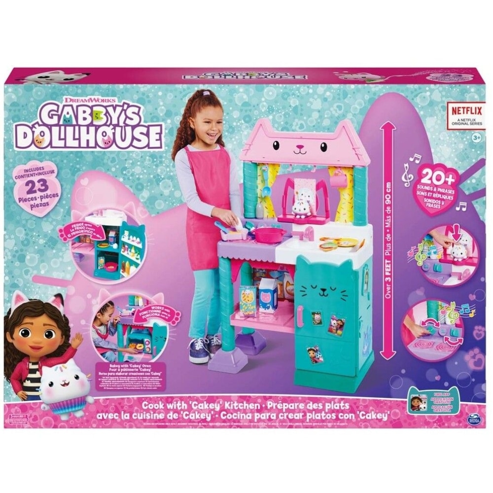 Gabby’s Nukkekoti keittiö 90 cm settissä on liesi, tiskiallas tiskihyllyllä, kymmenen keittiötarviketta ja -välinettä, ikkunan yläpuolella roikkuvat astianripustimet, 9 leikkiruokaa ja lelujääkaappi, jossa on kuvia Gabbystä ja hänen kissamaisen mahtavista kissanpennuistaan.