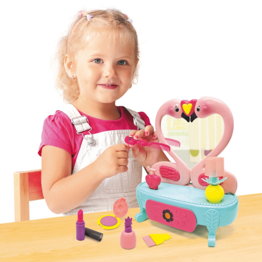 Ihana 7 osainen Flamingo meikkipöytäsetti sisältää valolla ja äänellä varustetun meikkipöydän sekä erilaisia tarvikkeita (hiusharja, hajuvesipullo, kynsilakka, huulipuna, meikkisivellin sekä meikkipeili)