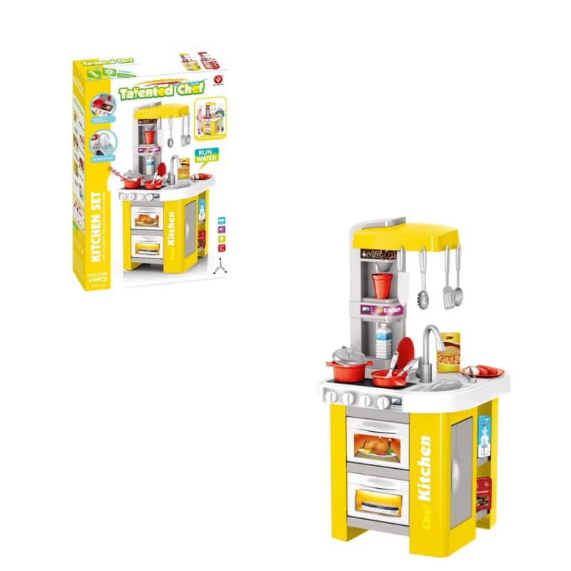 Keittiö & tarvikkeet keltainen – Moderni leikkikeittiö, jossa on kaikki mitä tarvitset kotikeittiössäsi. Tuote sisältää 49 osaa, kattavasti ruuanlaittovälineitä ja leikkiruokaa.