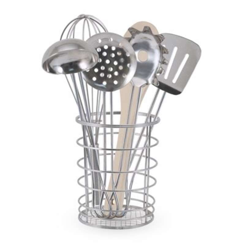 Pienen keittiömestarin unelma! Pakkauksessa vispilä, keitto-, spagetti- ja reikäkauhat, lasta sekä puinen lusikka. Leikin jälkeen välineet säilyvät siististi metallisessa telineessään.