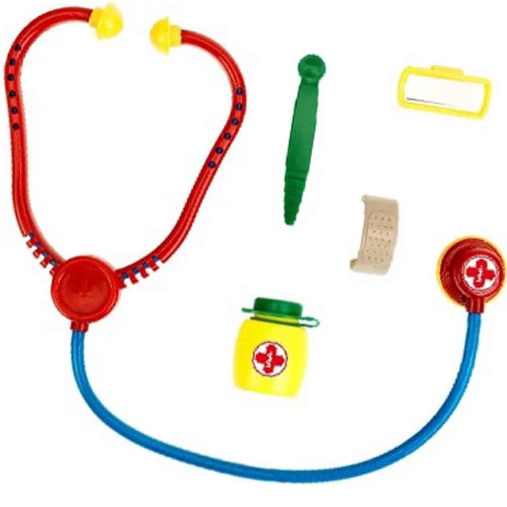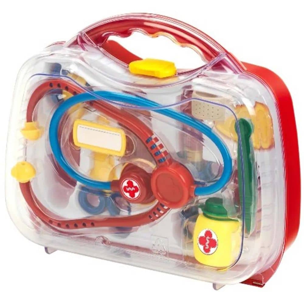 Kaunis lääkärilaukku on täydellinen varuste suosittuun ”Lääkärillä käynti” roolileikkiin. Kliinisen lämpömittarin, stetoskoopin, ruiskun, korvapeilin ja refleksivasaran avulla sairaat nuket ja pehmolelut tutkitaan perusteellisesti hetkessä ja ne toipuvat nopeasti.