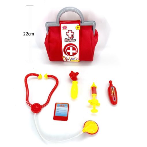 - Setti sisältää virkamerkin, stetoskoopin, korvalampun, kuumemittarin, ruiskun sekä lääkärin laukun.