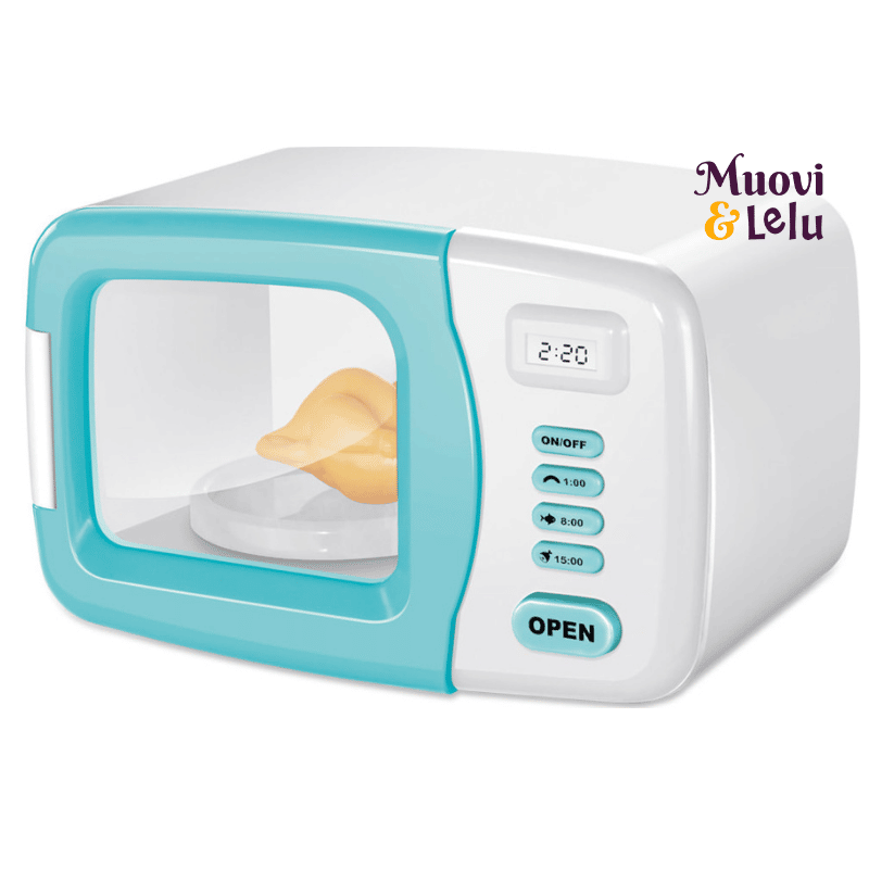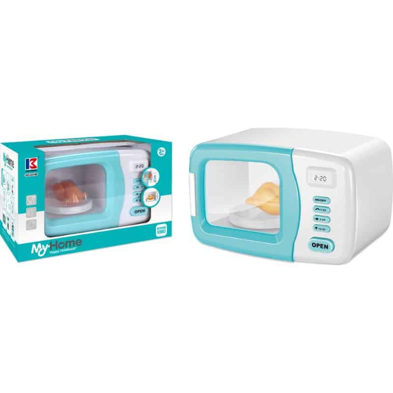 Sini-valkoinen paristokäyttöinen mikroaaltouuni lasten keittiöleikkeihin, jossa on avautuva ovi ja valot. Mikron sisällä oleva aluslautanen pyörii ja sen päällä on kanansiipi.
