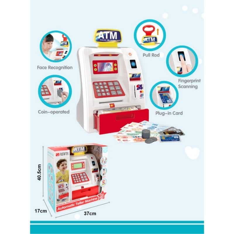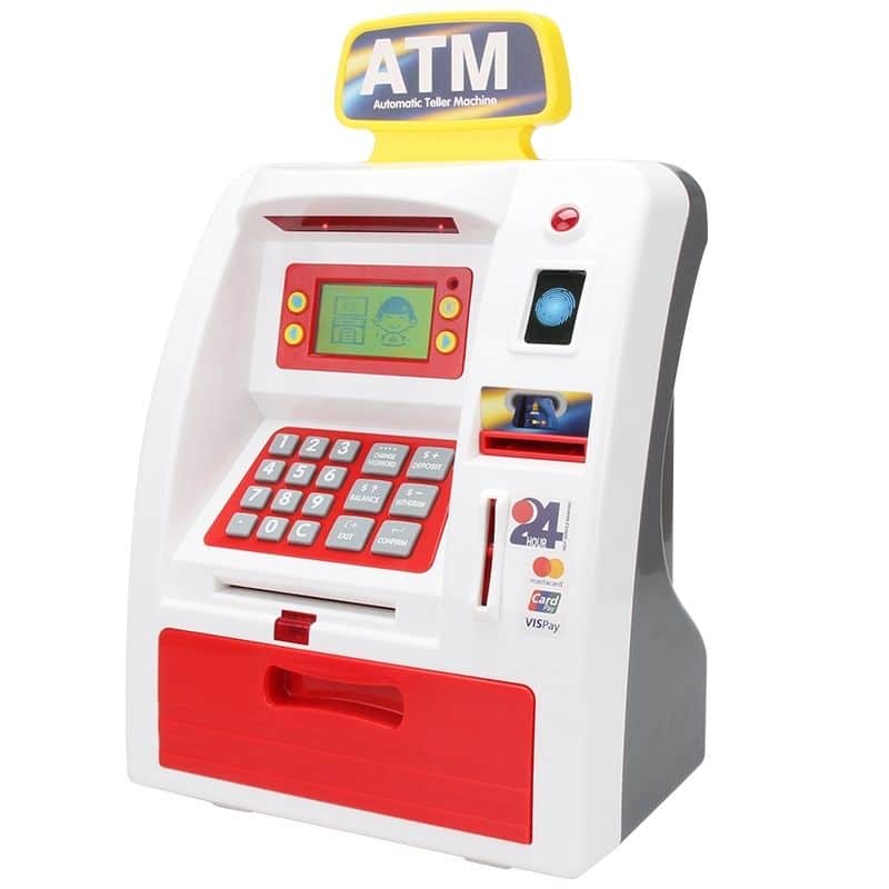 Pankkileikkeihin automaatti rahan nostamista ja tallettamista varten. Automaatin korkeus 40,5 cm. Automaatin mukana tulee leikkirahaa ja pankkikortteja.