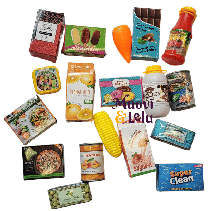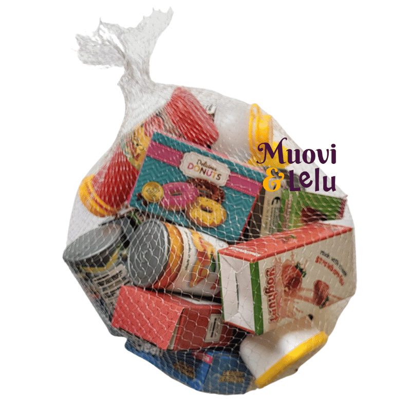 Mitä saisi olla kaupasta? Saisiko olla kenties jäätelöä tai kahvia? Tässä verkkopussissa on 18 erilaista leikkiruokaa, kuten donitseja, jäätelöä, maitoa, maissi, kahvia, jugurttia, mehua, salaattia ja säilykeruokia. Leikkiminen kehittää lapsen mielikuvitusta ja sosiaalisia taitoja. Ikäsuositus: 3+ vuotta.