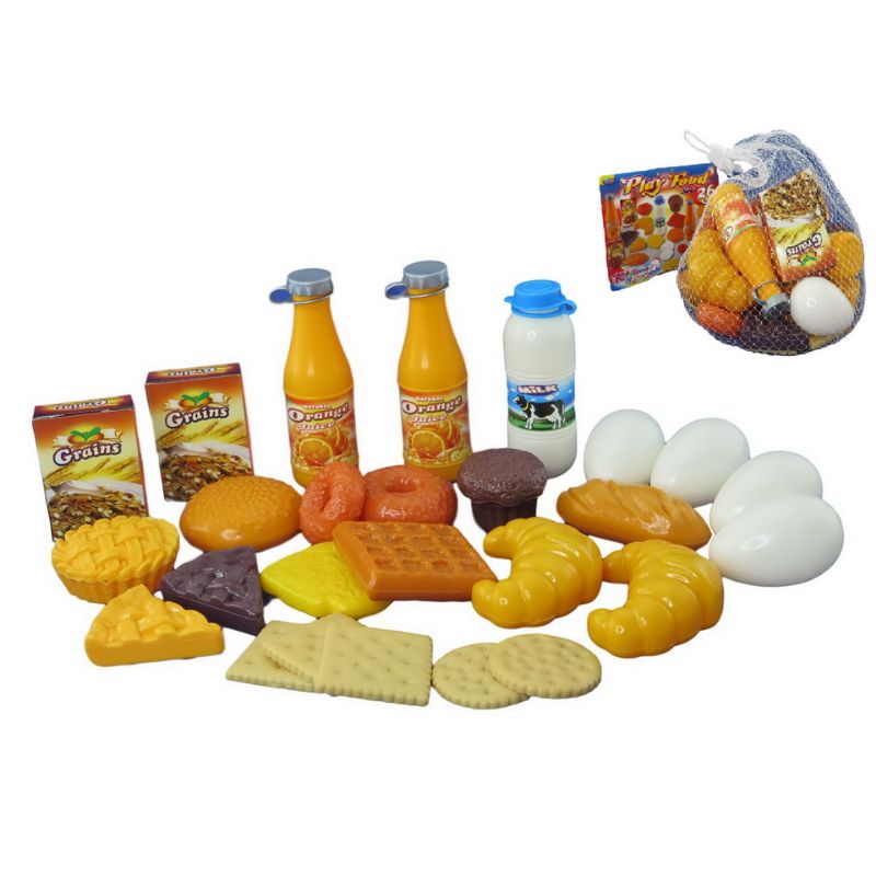 Hyvän aamiaisen ainekset ovat nyt valmiina nautittaviksi! Pussi sisältää 26 erilaista leikkiruokaa, kuten tuoremehupulloja, keksejä, kananmunia, croissantteja, maitoa, leipää ja keksejä.