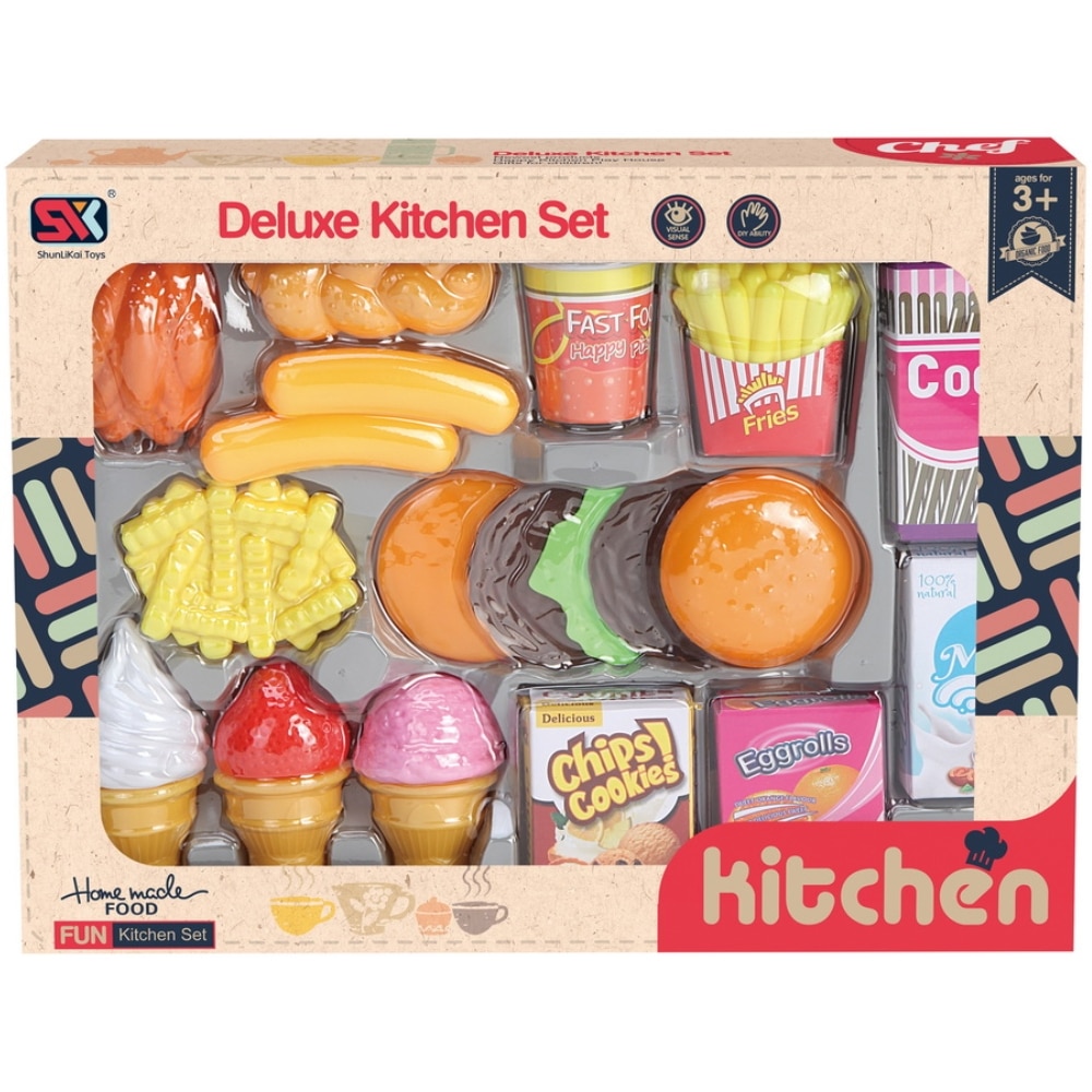 Ruokasetti Deluxe Kitchen on monipuolinen leikkiruokaruokapakkaus koti- ja kauppaleikkeihin. Pakkauksen mukana tulee paljon erilaista leikkiruokaa, sekä pahvipakkauksia, kuten leikkinakkeja, kanaa, jäätelöä, leipää, hampurilainen, mysliä ja maitoa. Ikäsuositus: 3+ vuotta.