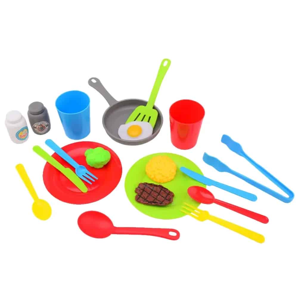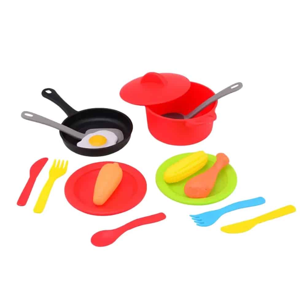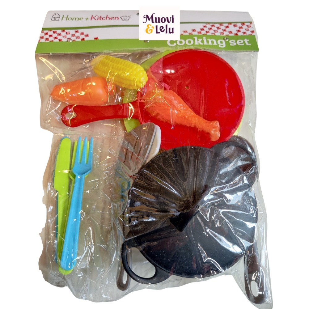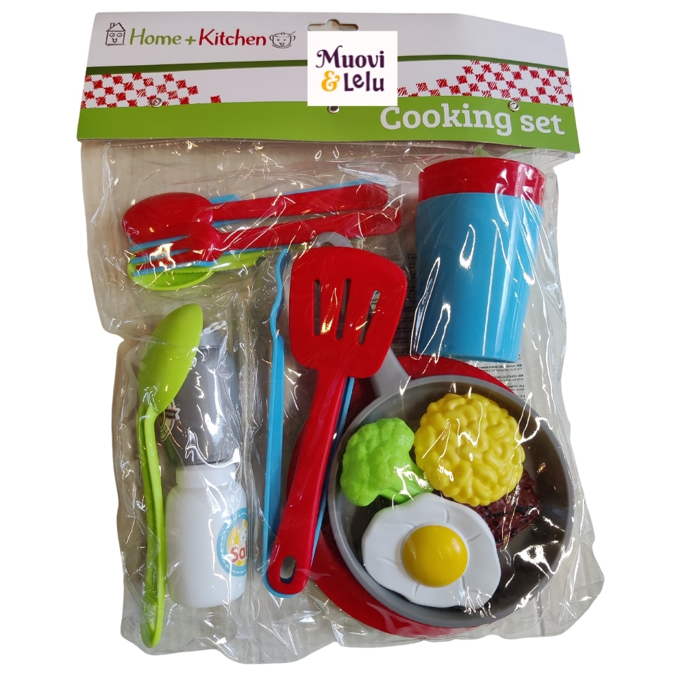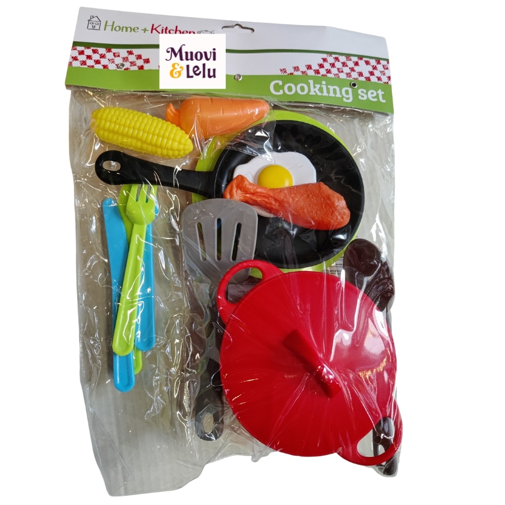 Mitä herkkuruokaa saisi tänään olla? Ruoan teko voi alkaa ruokasetti home + kitchen erilaisia setillä. Lajitelmassa on kolme erilasta settiä, joissa on leikkipaitovuoka, paistinlasta, leikkiruokaa, aterimia ja kahdessa paitovuoka.