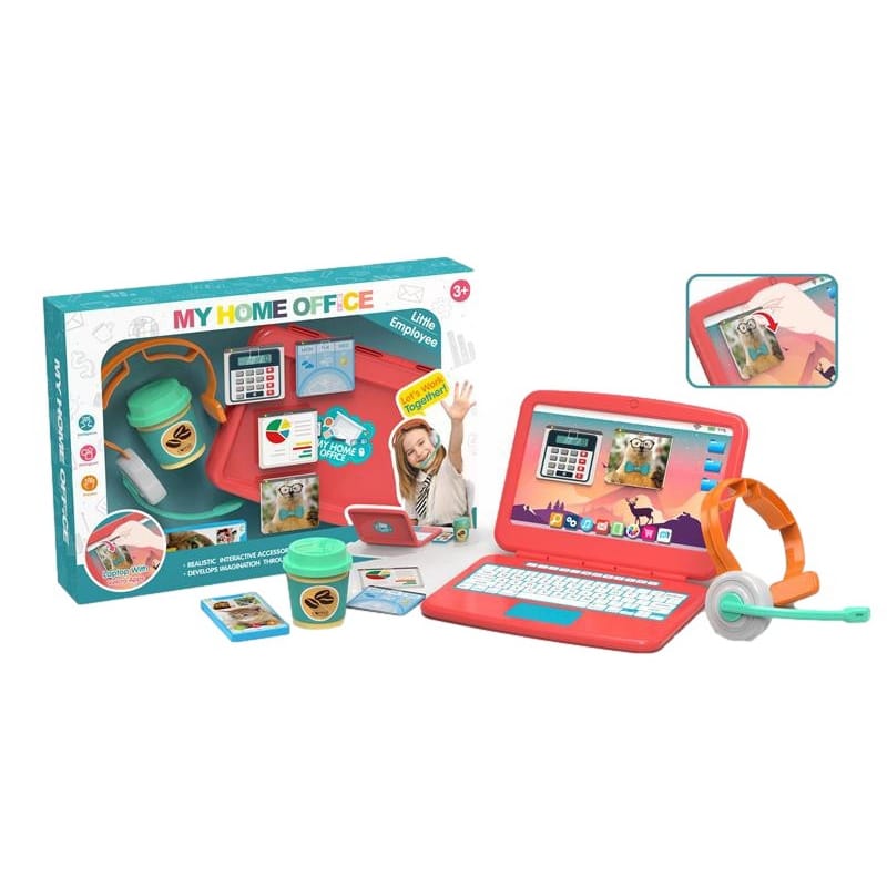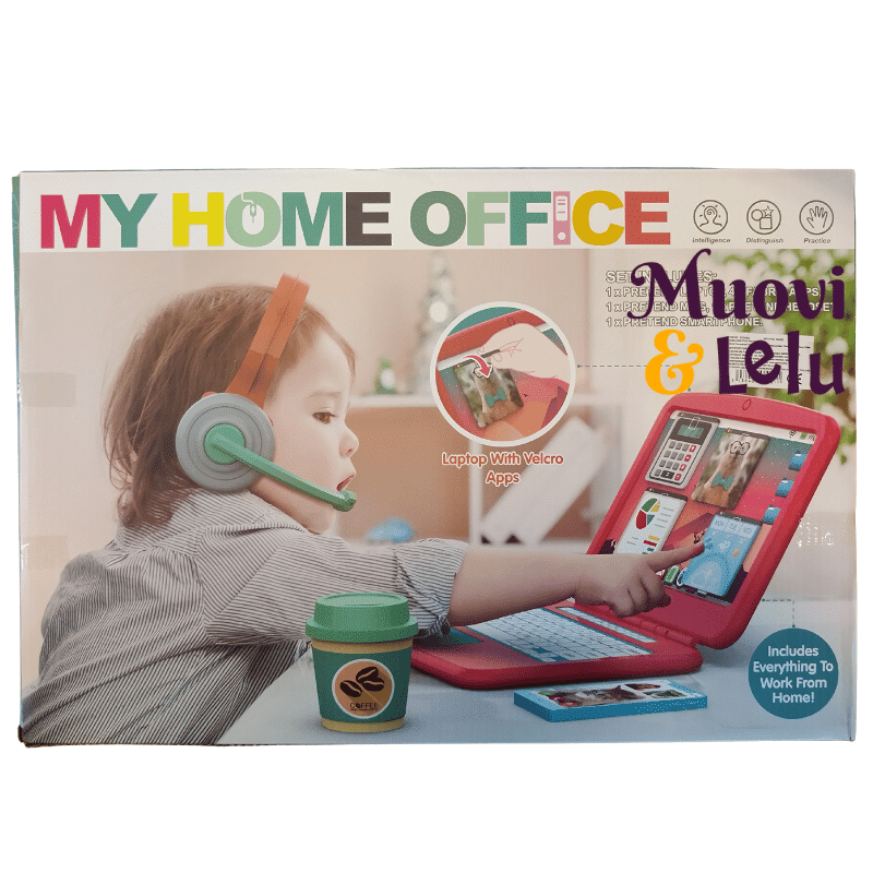 Tässä setissä on pienen toimistotyöntekijän etätyöpisteeseen kaikki tarvittava! Pakkauksen mukana tulee leikkikuulokkeet, älypuhelin, läppäri, kahvikuppi ja kortteja. Tietokoneen näytössä on tarranauhaa, joten voit ”muokata” kotivalikkoa mukana tulevilla sovelluskuvakkeilla. Hyviä toimistohetkiä!