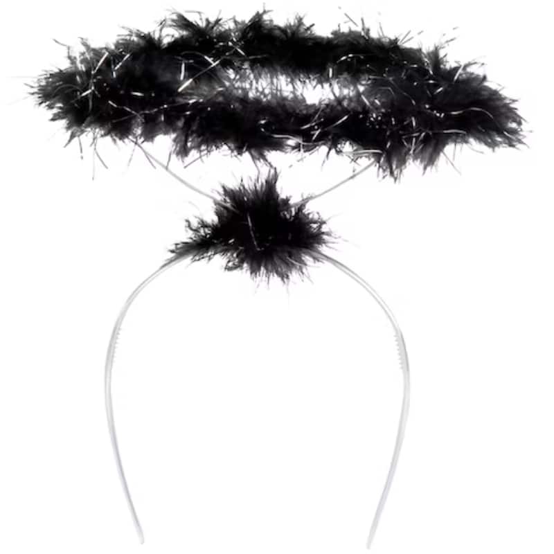 Muovinen läpikuultava ohut hiuspanta, jossa musta pörröinen sädekehä. Sädekehä rautalankaa, joka taivuteltavissa.