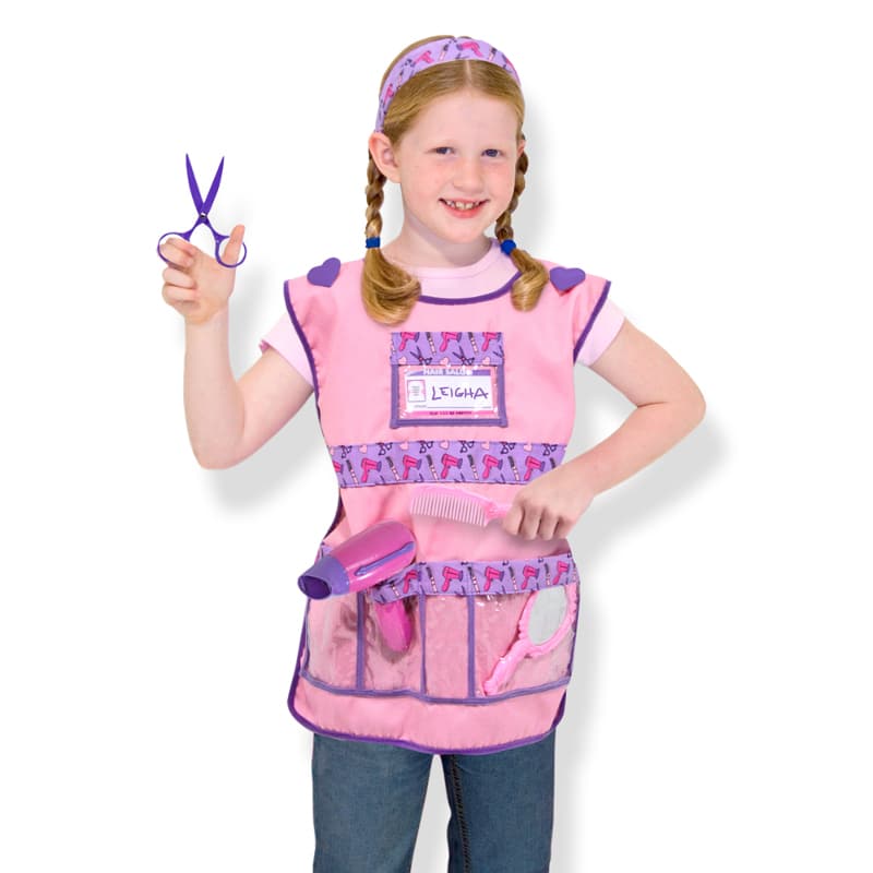 Tämä asu ylläsi voit kokeilla kampaajan työtä! Nuoret kampaajat voivat pistää päähän hiuspannan ja pukeutua essuun, jossa on taskut jokaiselle tarvikkeelle. Essuun saa oman nimikyltin. Mukana on hiusharja, sakset(eivät leikkaa oikeasti), käsipeili ja hiustenkuivaaja. Kuivaajassa on ääniefekti.