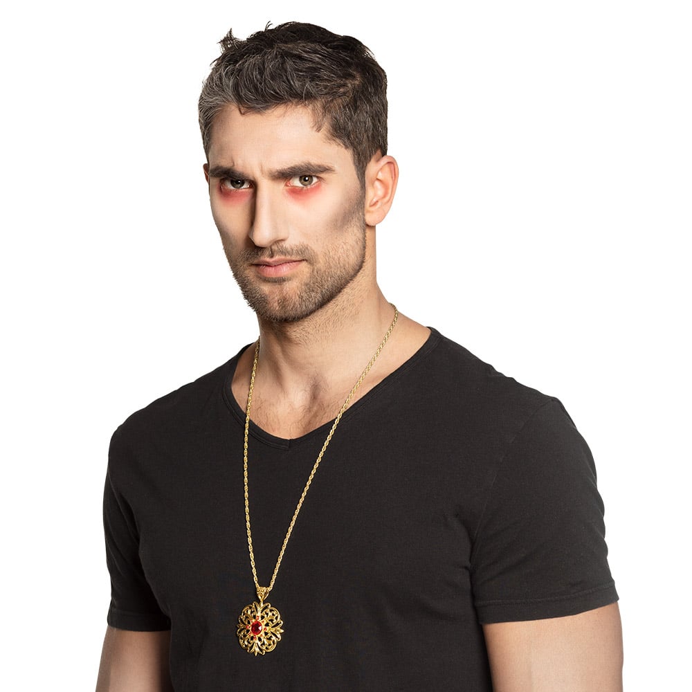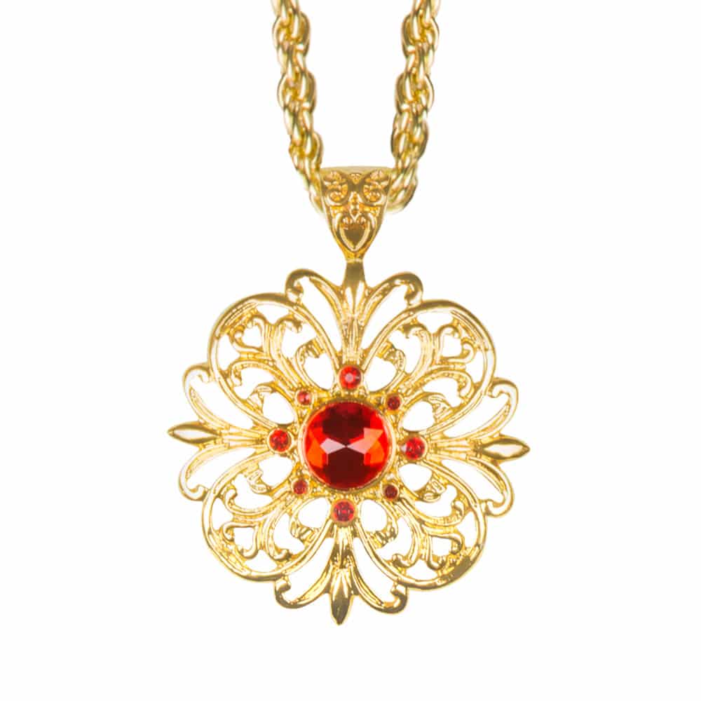 Tämä kultainen kaulakoru, jossa on punaisia leikkitimantteja sopii halloweeniin, naamiaisiin ja roolileikkeihin. Riipus on noin 43 cm pitkä.