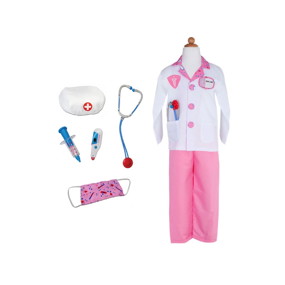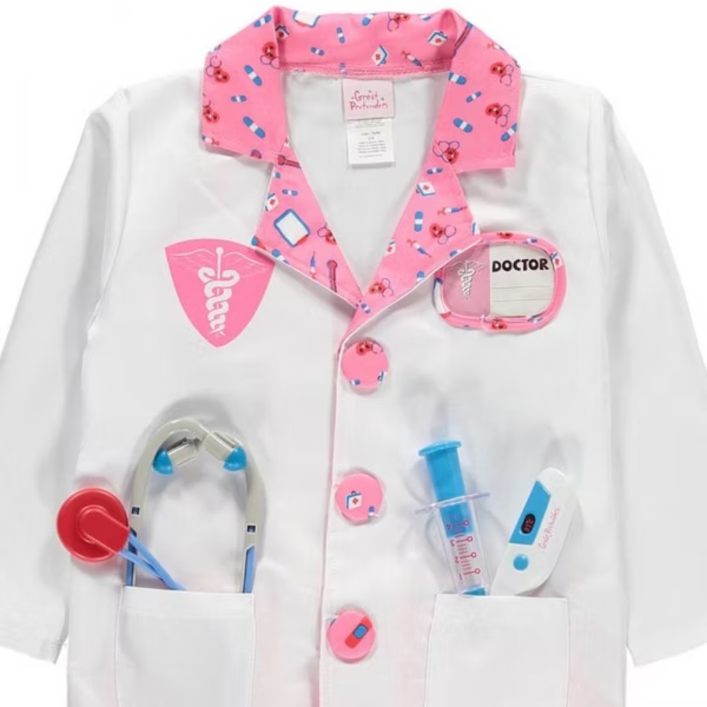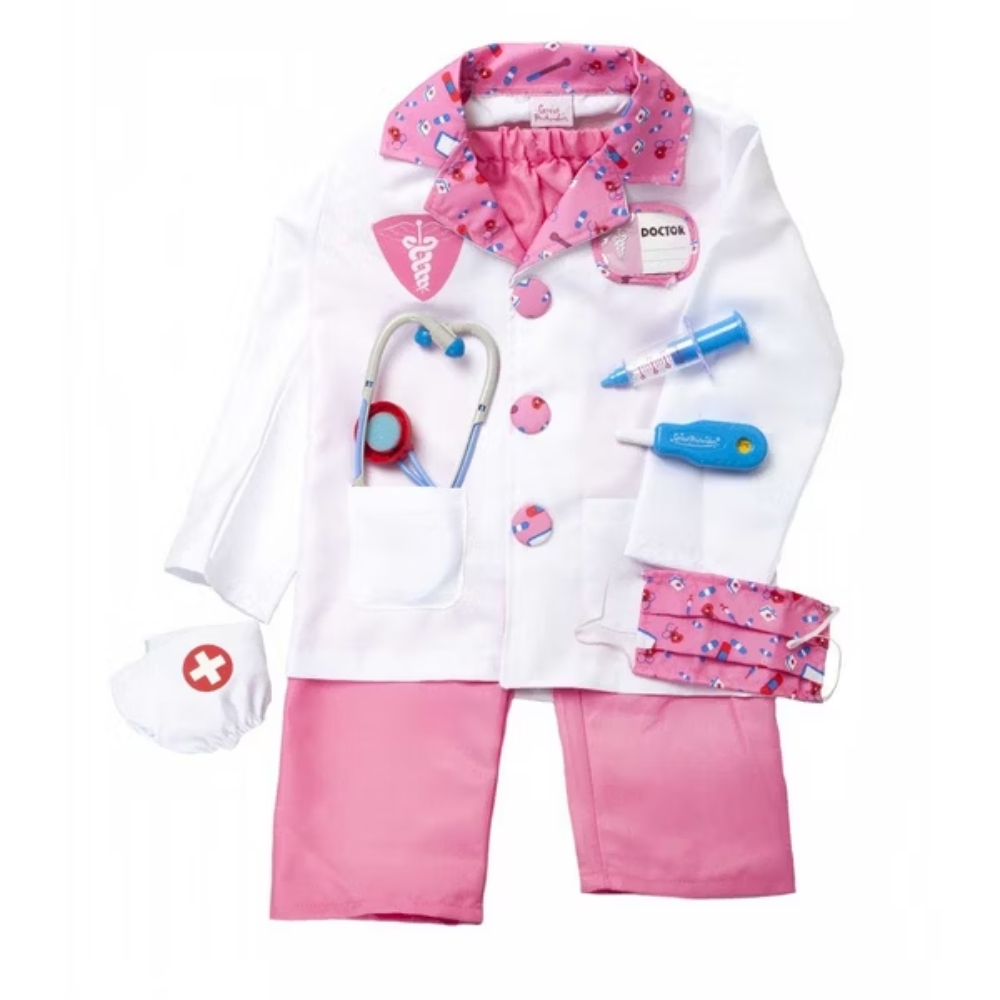 Lääkäri on paikalla! Näytä tyylikkäältä tässä lääkäriasussa, kun diagnosoit ja hoidat leikkipotilaita. Setti sisältää valkoisen lääkärintakin, vaaleanpunaiset leikkaussalihousut, vaaleanpunaisen kangasmaskin, valkoisen hatun, leikkistetoskoopin, leikkiruiskun ja leikkilämpömittarin. Takkiin on ommeltu lääkärin nimikylttipidike, jossa on irrotettava nimikyltti ja tarranauhat.