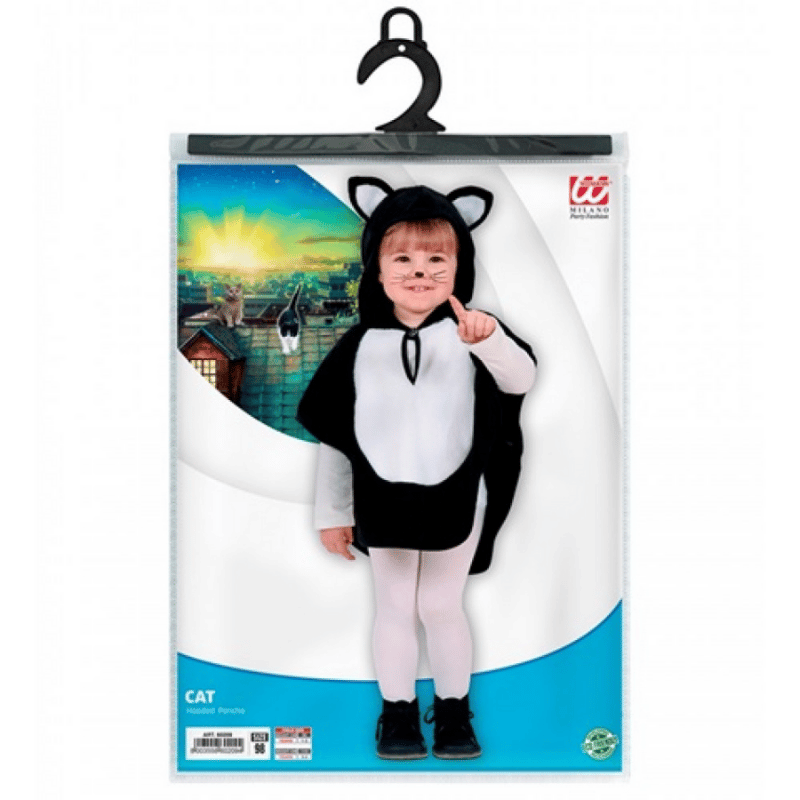 Suloinen musta-valkoinen viitta hupulla. Hupussa korvat, 3dessä kaula-aukolla nappi kiinnitys.