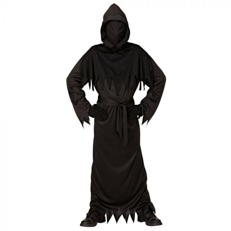 Halloween-asuksi sopiva musta huppukaapu on materiaaliltaan joustavaa polyesteriä. Hupussa kasvojen kohdalla ohut kangas, josta näkee läpi. Huppua ei pysty nostamaan kasvoilta pois. Säväyttävän synkkä kauhuasu! Asun mukana tulee myös vyö. Naamiaisasu sopii niin viikatemiehelle kuin kaikille muille synkille pimeyden hahmoille.