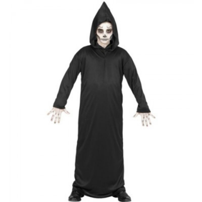 Musta viikatemiehen hupullinen musta kaapu lapsille Halloween-asuksi tai muihin naamiaisjuhliin! Soveltuu 5-7-vuotiaille lapsille.