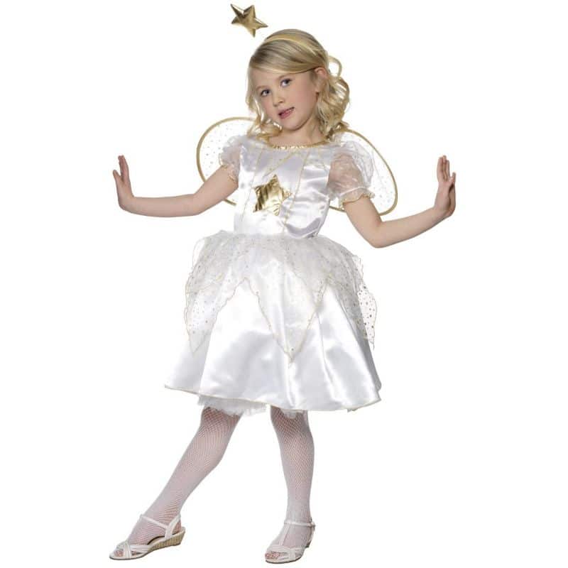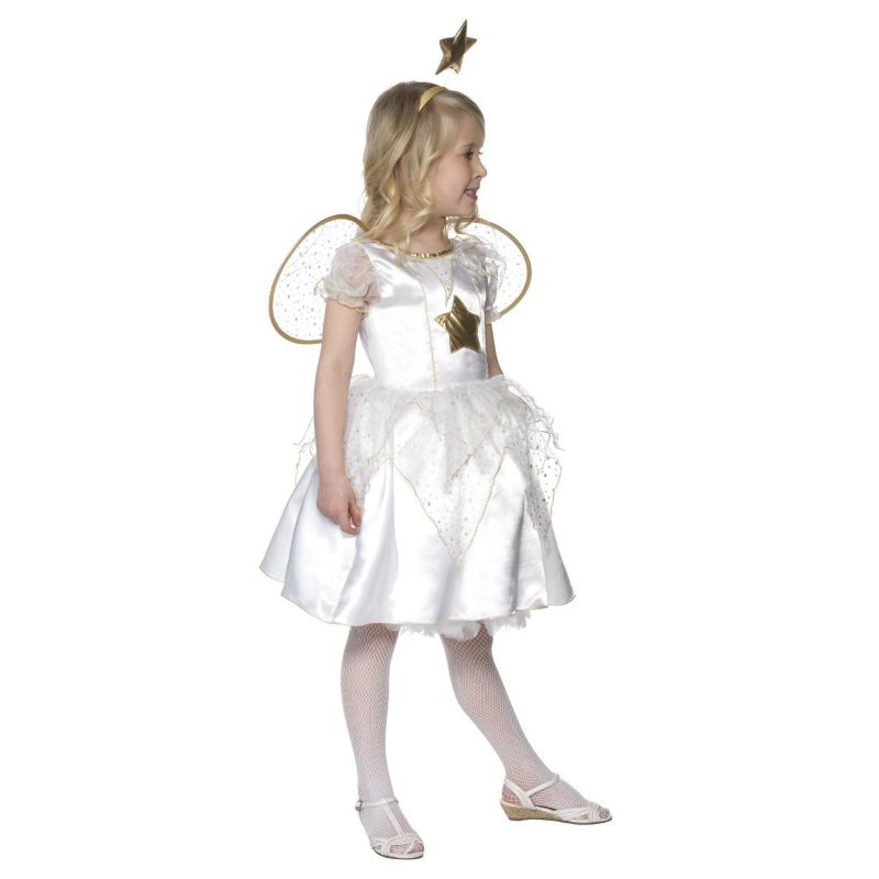 Ihana tähtikeiju asu sopii loistavasti roolileikkeihin ja naamiaisiin! Asuun kuuluu valkoinen satiinimekko, jossa on tyllihihat ja helmaosassa kaksi eri pituista tyllikerrosta. Mekossa on kullanväriset yksityiskohdat. Selässä on kultaiset siivet, siivissä on tarranauha kiinnitys selkäpuolelle. Asun kruunaa kultainen hiuspanta tähtikoristeella.