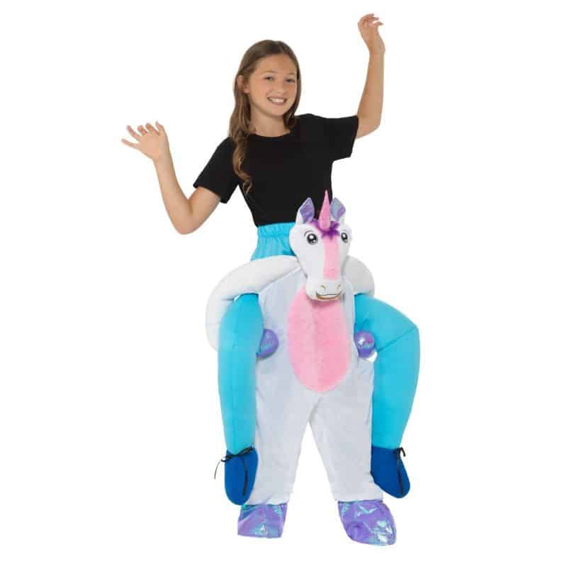 Yksisarvisen reppuselkäkyyti-naamiaisasu lapsille. Hyppää tarunhohtoisen yksisarvisen kyytiin tällä yksiosaisella, roikkuvat tekojalat sisältävällä hauskalla lasten naamiaisasulla.